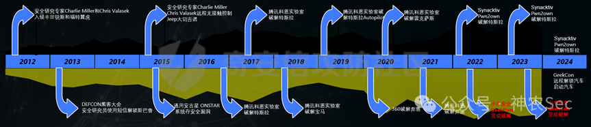 汽车安全的时间线,可以回溯到十多年前,安全研究者们就开始挖掘汽车上的漏洞;自此汽车攻防拉开序幕,攻击难度和成本逐年提升,我们在下面这个图里可以看到,Tesla多次被破解,但是这也恰恰说明特斯拉是非常重视安全的,值得我们去学习。