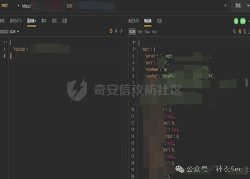 我们逆向车主APP,发现有个接口,通过VIN码获取MQTT的账户和密码