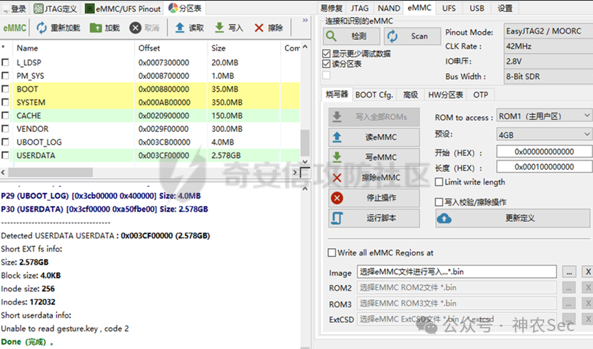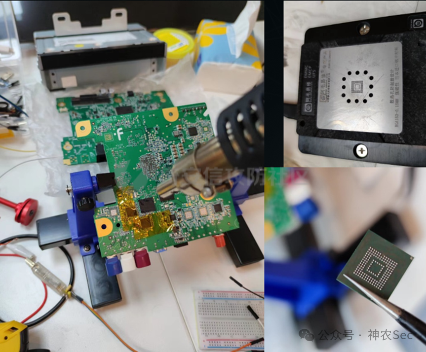 对零部件上的存储芯片进行提取,首先我们通常会找调试口,但是汽车和消费级的IoT设备不太一样,一般调试口不会保留,需要自己从芯片的Datasheet里找,有些BGA封装的芯片,则需要我们吹下来,放在芯片座上进行编程、也可以把引脚飞线出来连接我们的调试工具。
