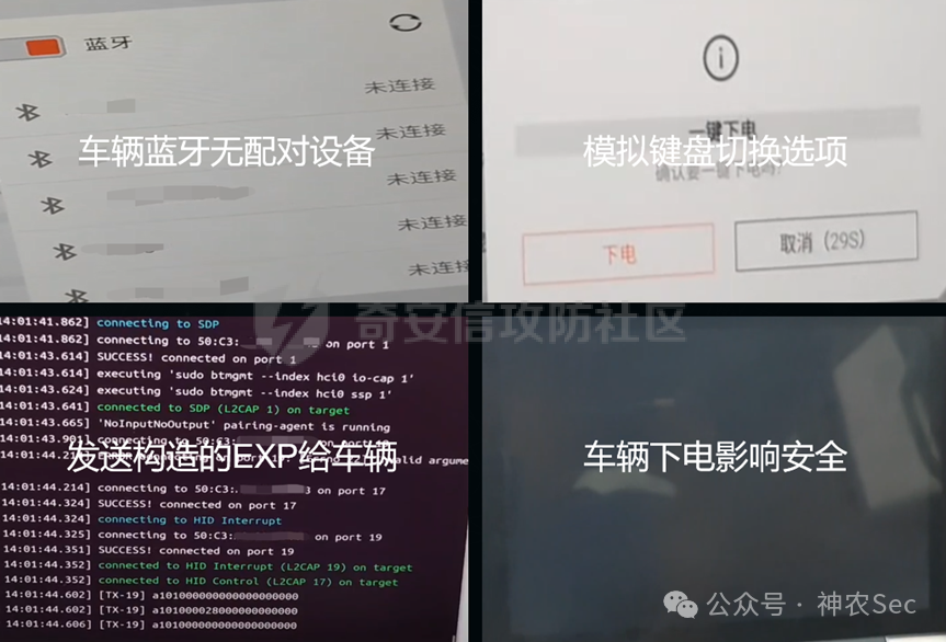 首先我们不需要进行蓝牙配对,也就是说下面的攻击都是无感进行的,发送payload给车机,我们的攻击模拟了HID设备键盘,随即车机就会进入切换,这里我们演示的是一键下电,然后车机就可以下电,影响行车安全