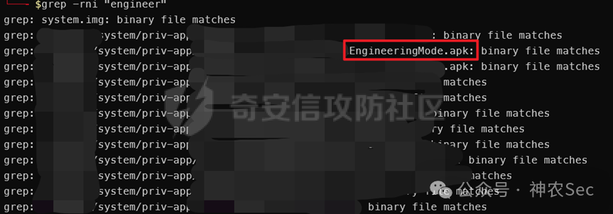 安卓的文件系统,大家应该挺熟悉的,如果不熟悉也没关系,我们可以上字符串匹配大法,如果你搞安全请牢记此方法。3秒我们就定位到了工程模式app