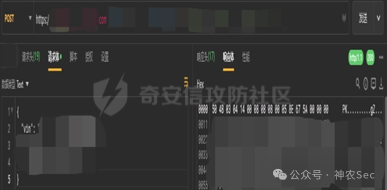 我立刻尝试登录,发现不行,其实很正常,端口是433,应该是加了TLS,所以还需要证书、客户端证书、客户端私钥才能登录,然后我继续逆向,发现有个接口,可以获取到证书,下图响应体是个压缩包