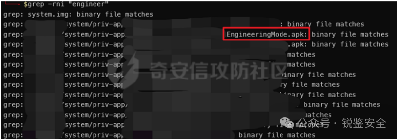 安卓的文件系统,大家应该挺熟悉的,如果不熟悉也没关系,我们可以上字符串匹配大法,如果你搞安全请牢记此方法。3秒我们就定位到了工程模式app