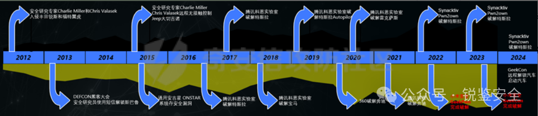 汽车安全的时间线,可以回溯到十多年前,安全研究者们就开始挖掘汽车上的漏洞;自此汽车攻防拉开序幕,攻击难度和成本逐年提升,我们在下面这个图里可以看到,Tesla多次被破解,但是这也恰恰说明特斯拉是非常重视安全的,值得我们去学习。
