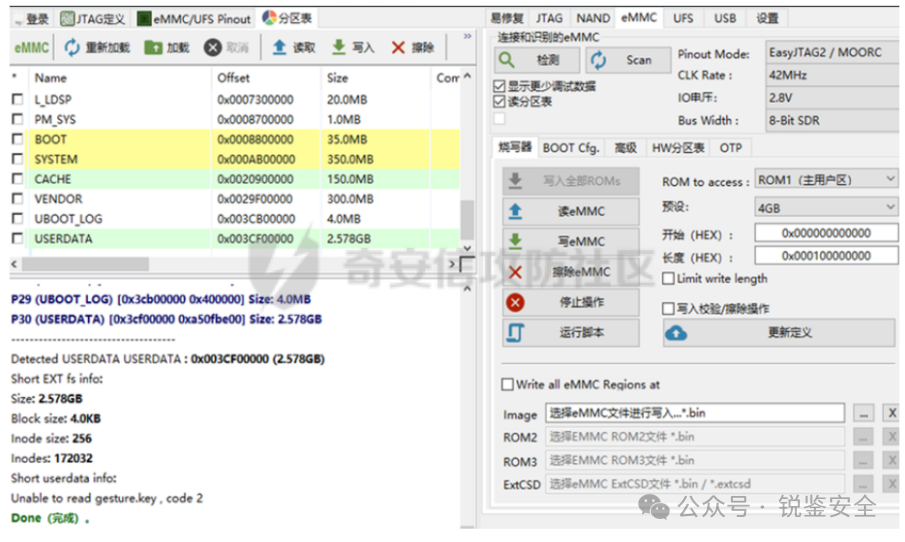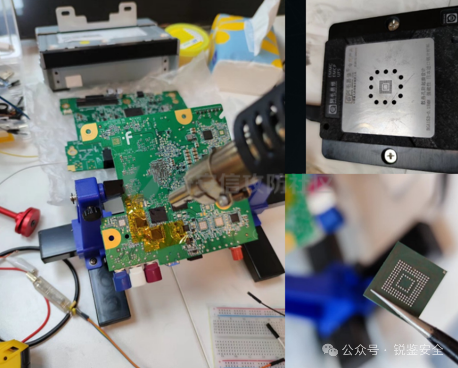 对零部件上的存储芯片进行提取,首先我们通常会找调试口,但是汽车和消费级的IoT设备不太一样,一般调试口不会保留,需要自己从芯片的Datasheet里找,有些BGA封装的芯片,则需要我们吹下来,放在芯片座上进行编程、也可以把引脚飞线出来连接我们的调试工具。