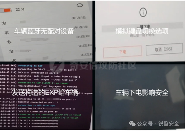 首先我们不需要进行蓝牙配对,也就是说下面的攻击都是无感进行的,发送payload给车机,我们的攻击模拟了HID设备键盘,随即车机就会进入切换,这里我们演示的是一键下电,然后车机就可以下电,影响行车安全