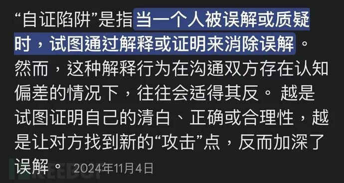 已经产生危机的情况下, 你怎么说你自己做的好, 自己无辜都没用,所以是自证陷阱,本质是信任危机。