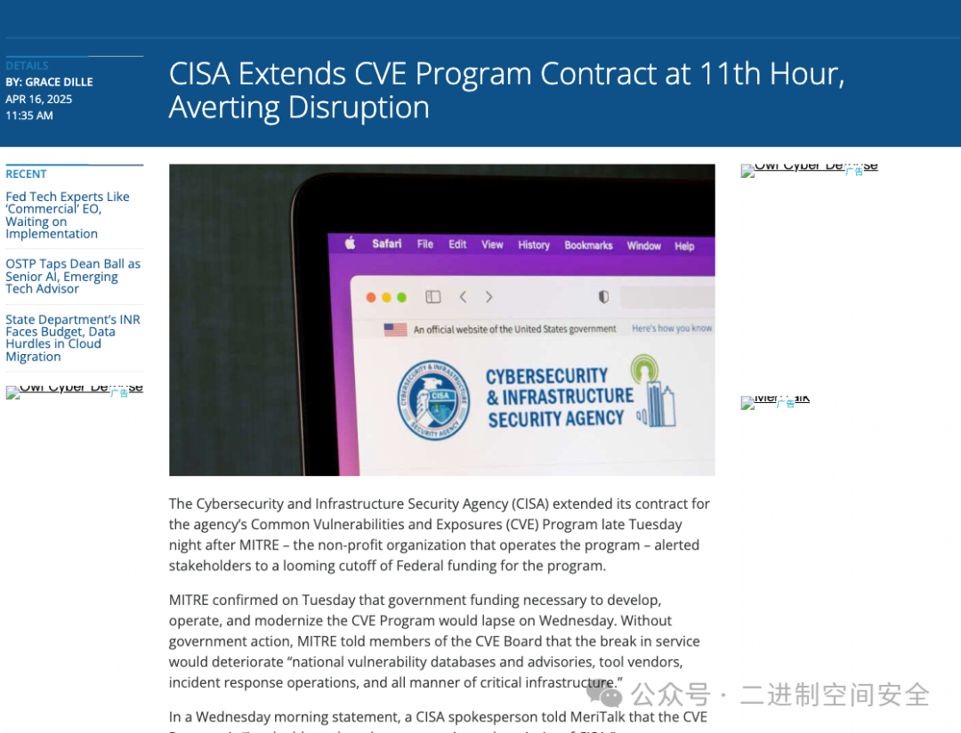 https://www.meritalk.com/articles/cisa-extends-cve-program-contract-at-11th-hour-averting-disruption/