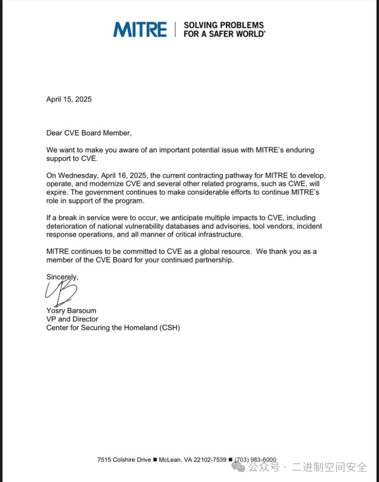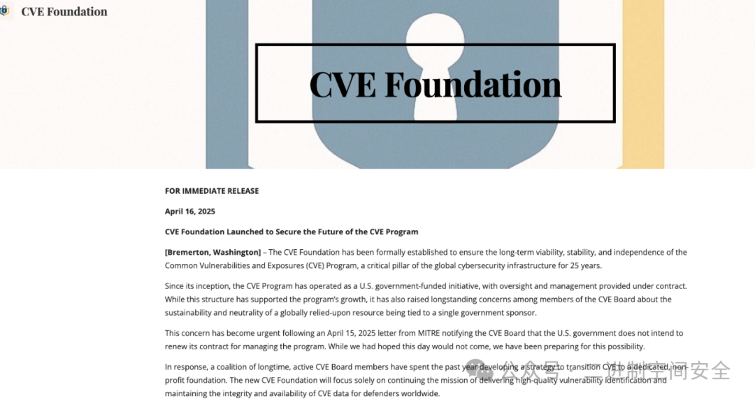 MITRE 目前用于开发、运营和现代化 CVE 及其他相关项目的合同渠道将于 2025 年 4 月 16 日到期。如果发生服务中断,CVE 将受到多方面影响,包括国家漏洞数据库和安全通告的恶化、安全工具厂商、事件响应操作及关键基础设施等都会受影响。在资金到期后,CVE 网站仍将继续上线,但新漏洞将不再被分配 CVE 编号。