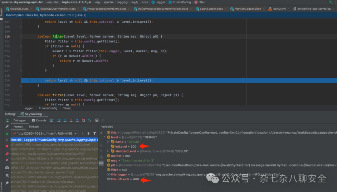 其他的点是LOGGER.debug,当进入到org.apache.logging.log4j.core.Logger.PrivateConfig#filter方法中,在配置文件中要求的是info级别400,这里传进来的是debug级别为500,400小于500所以返回false