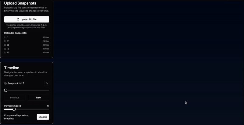 为了更好地理解这些概念,我搭建了一个小平台,用来查看和分析 Git 仓库中的文件目录变更,以可视化展示哪些对象被创建、修改或删除。显然,这对于这个项目来说有些大材小用,但当时 coding 氛围正浓,花了不到 5 分钟就搞定了,所以为什么不做呢 🙂