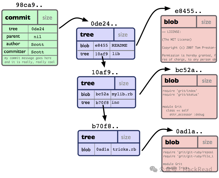 – • 指向树对象的引用,该树对象表示该次提交时的文件结构。