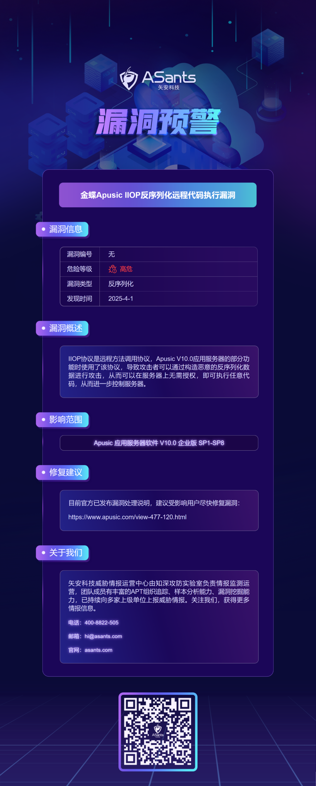 漏洞预警|金蝶 Apusic IIOP 反序列化远程代码执行漏洞 发布于2025年4月2日2025年7月19日 作者:cve-20 漏洞预警|金蝶 Apusic IIOP 反序列化远程代码执行漏洞 威胁情报运营中心 矢安科技 2025-04-01 17:05