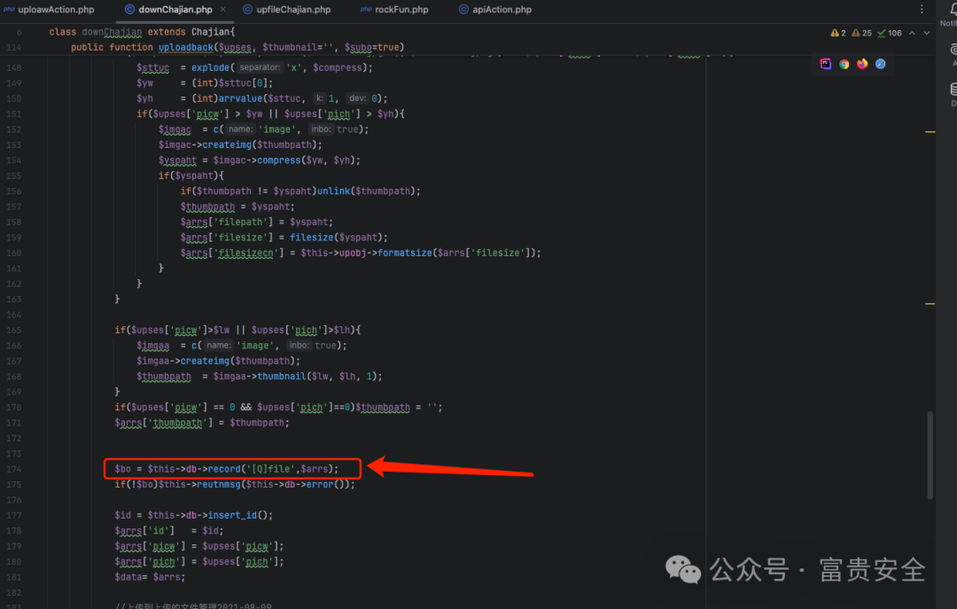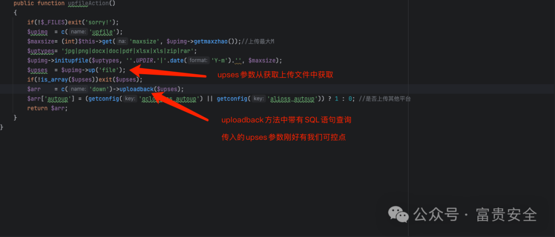 然后走到$arr = c(‘down’)->uploadback($upses);,调用downchajian.php中的uploadback方法,传入upses参数,跟进uploadback方法。