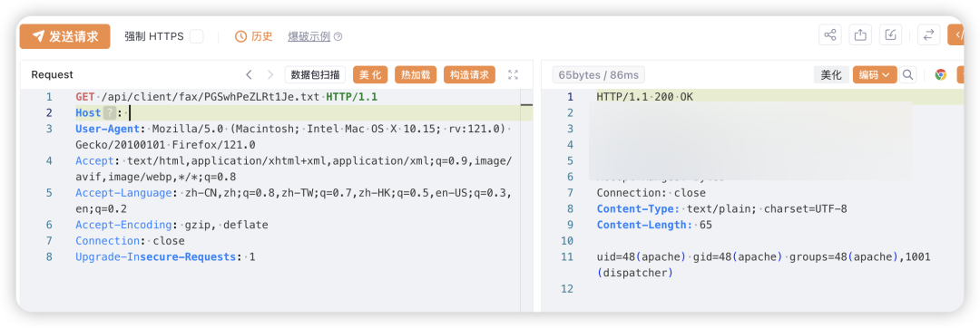 GET /api/client/fax/PGSwhPeZ&LRt1Je.txt HTTP/1.1Host: User-Agent: Mozilla/5.0 (Macintosh; Intel Mac OS X 10.15; rv:121.0) Gecko/20100101 Firefox/121.0Accept: text/html,application/xhtml+xml,application/xml;q=0.9,image/avif,image/webp,*/*;q=0.8Accept-Language: zh-CN,zh;q=0.8,zh-TW;q=0.7,zh-HK;q=0.5,en-US;q=0.3,en;q=0.2Accept-Encoding: gzip, deflateConnection: closeCookie: PHPSESSID=9d162ed31bcb785f6f5cb1fcc92dfff2Upgrade-Insecure-Requests: 1