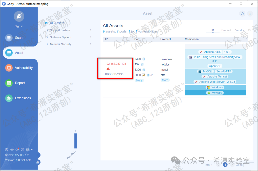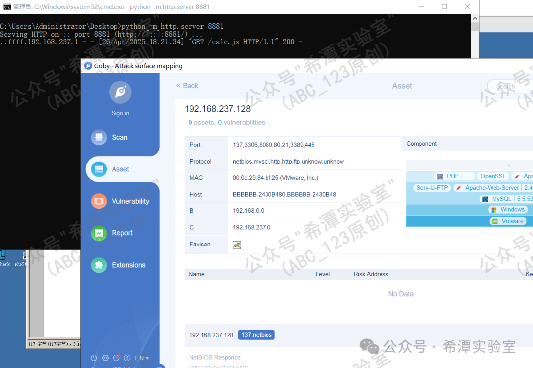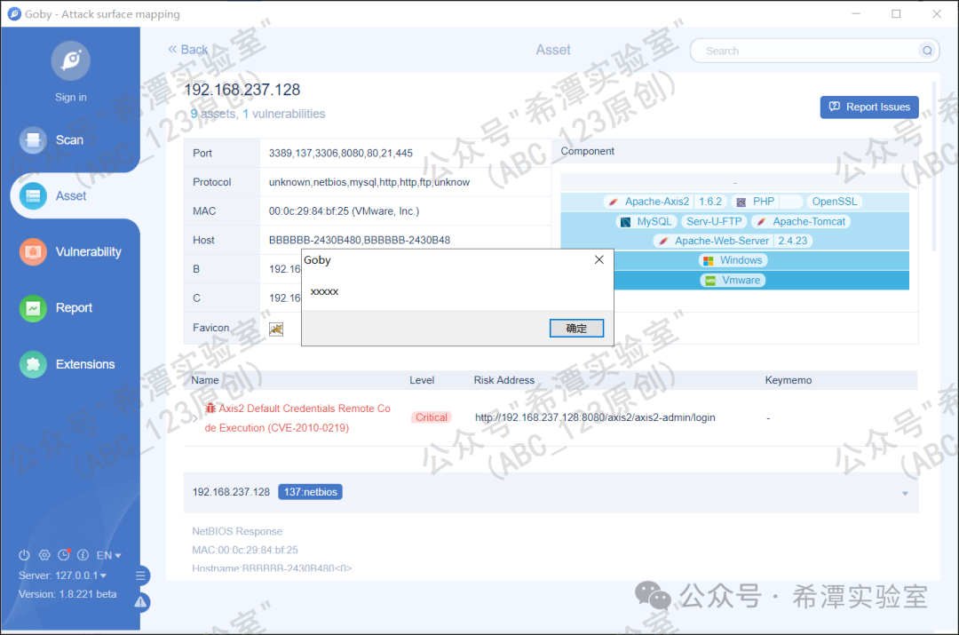 当红队人员使用Goby工具扫描192.168.237.128这个IP地址时,Goby通过端口扫描会访问到该IP的80端口的web服务,会访问到植入了恶意代码的页面。由于未对解析HTTP响应头进行严格过滤,就可能直接在Goby客户端触发XSS弹窗,从而实现对红队人员的初步反制。