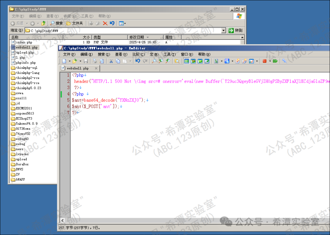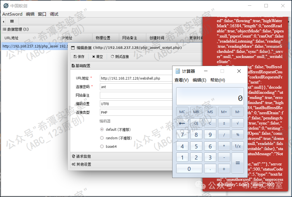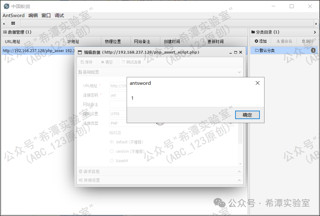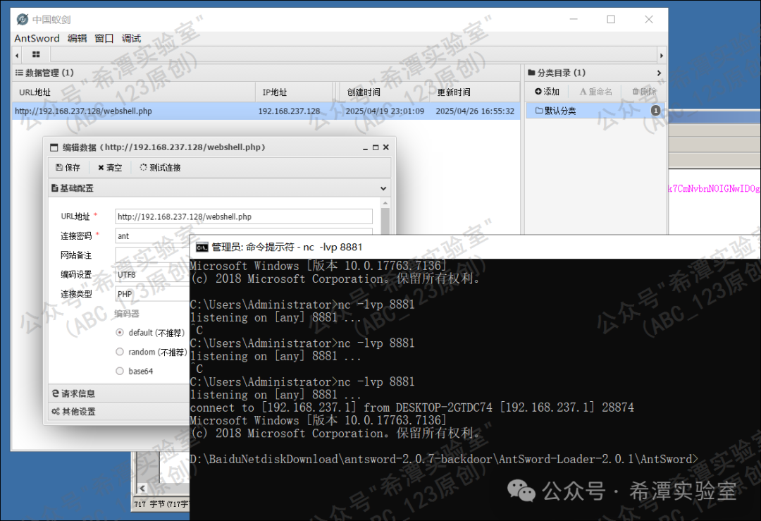 经过ABC_123的测试,发现这一方法仅适用于早期版本(AntSword <=2.0.7)的蚁剑webshell管理工具,在最新版本中已无法复现成功。需要注意的是,目前网上流传的许多payload在实际测试中并不可用,存在较多失效或拼写错误的情况。该反制方法的典型应用场景是:蓝队在发现红队上传的PHP等类型的WebShell后,可以主动在红队人员的WebShell中插入特制的反制代码。当红队人员后续使用蚁剑客户端连接该WebShell时,就会在不知情的情况下执行蓝队人员事先植入的命令,从而达到反制效果。