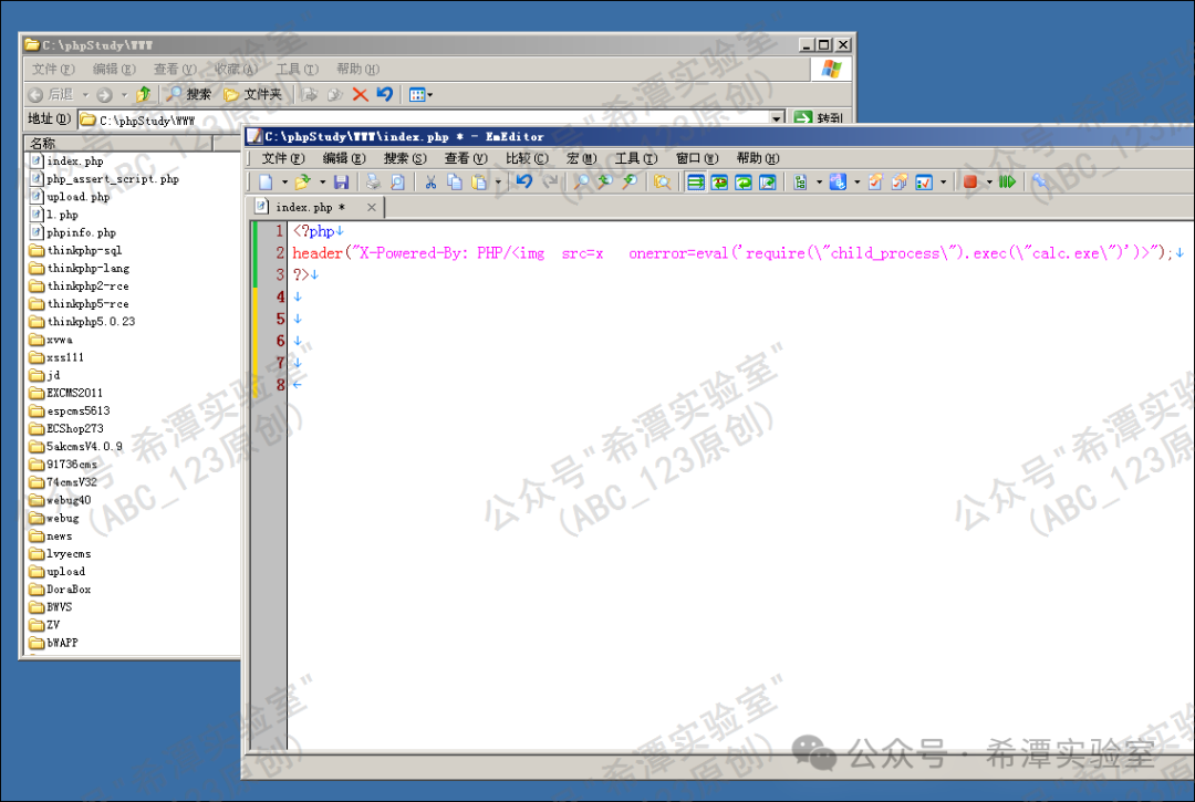 calc.exe命令的PHP代码如下:以下代码通过设置特殊的HTTP响应头,在响应中插入一个带有onerror事件的标签。当Goby等基于Node.js环境的客户端访问该页面时,若未对返回内容进行严格校验,onerror触发后会在客户端直接执行JavaScript代码,调用Node.js的child_process.exec模块,从而在本地弹出计算器(calc.exe),实现命令执行效果。