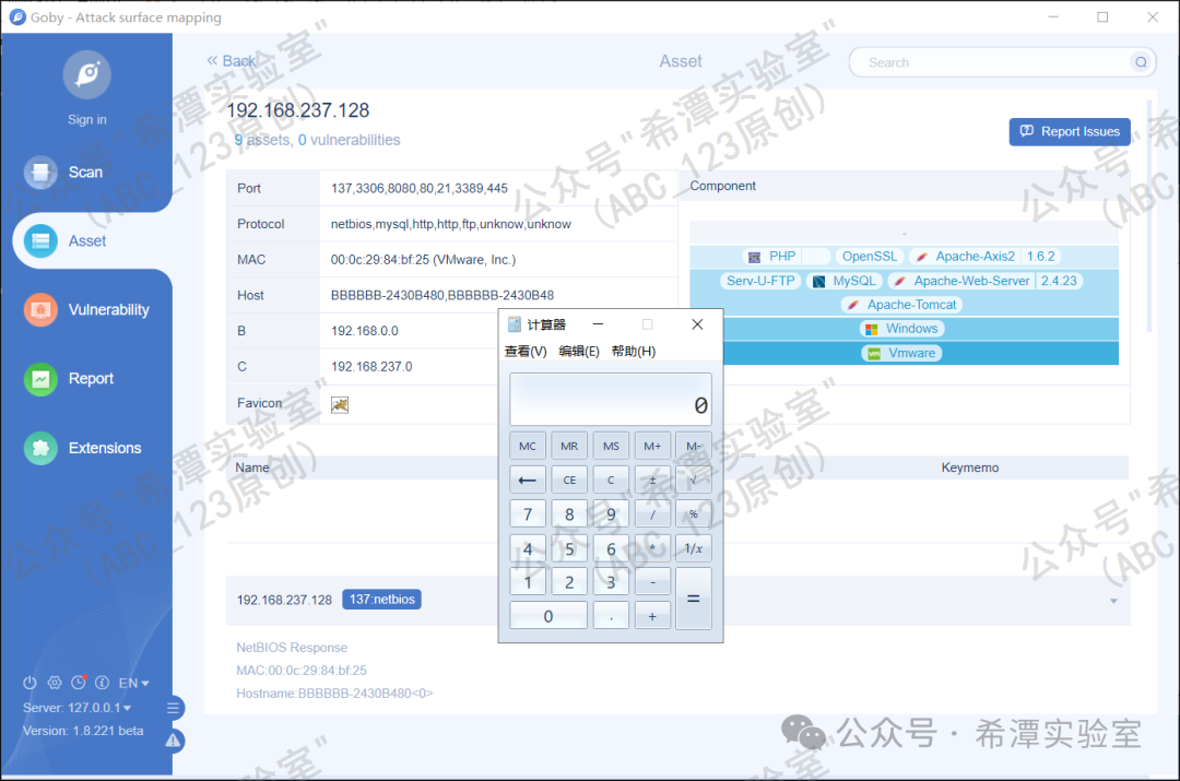 接下来使用goby对该ip进行扫描,发现成功弹出计算器。
