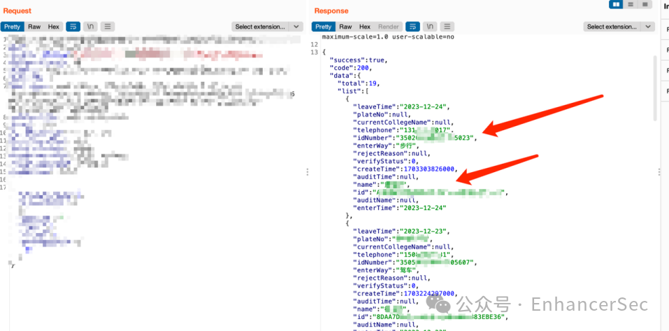例 如 点 击xxx 申 请 , 会 触 发 如 下 请 求 包 , 返 回 包 中 含 有 大 量 的 姓 名 、 手 机 号 、 身 份 证 信 息