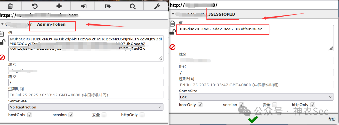 这里需要注意的是这个小饼干插件,新版本的若依系统的cookie值是Admin-Token值且是JWT编码的,右边的是老版本的,就是jsessionid值