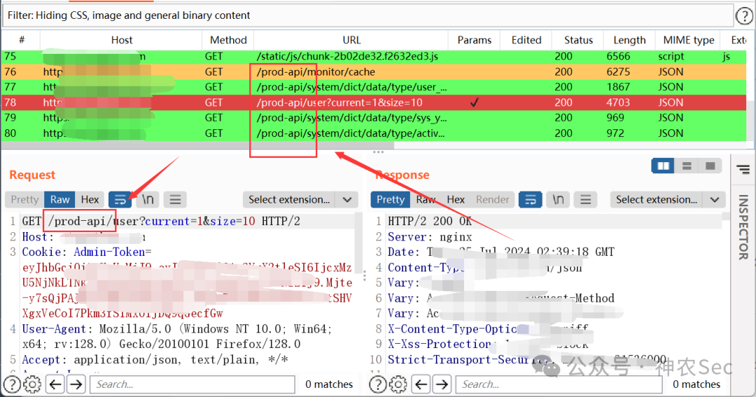 可以看到bp数据包里面有很多的/prod-api接口,其实看若依系统多的师傅们都这到这个接口就是若依框架的常见的一个关键字接口