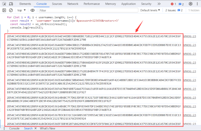 const result = 'username='+usernames[i]+'&password=123456&rootsrc=3' const result2 = xs_strEnccs(result); console.log(result2); }
