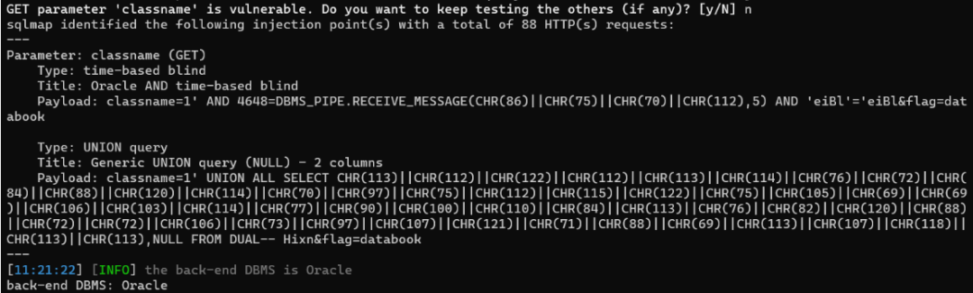 参数classname存在注入,使用sqlmap进行验证数据包,后端数据库为Oracle