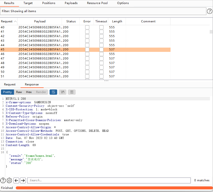 加密完的字典之后,将登录的数据包直接转发到burp的intruder中替换参数进行爆破