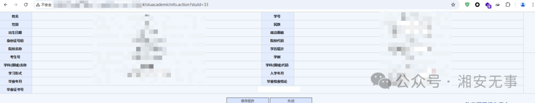 /xaws/xaws/sqg!stuacademicInfo.action?stuId=33然后遍历stuId,可查看全校的学历信息,数万条敏感信息 我就不bp遍历了