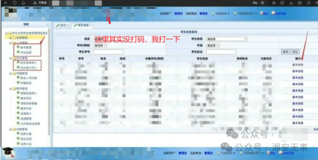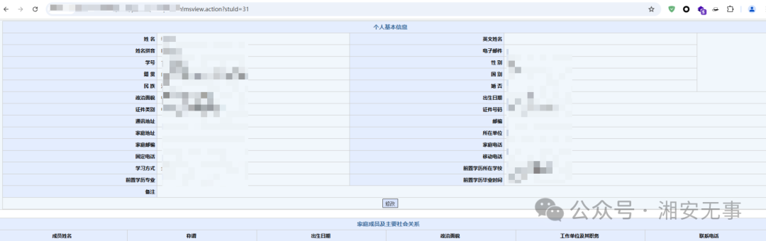 /xaws/xaws/xaws!admin.action?stuId=31然后遍历stuId,可查看全校的学籍信息,数万条敏感信息