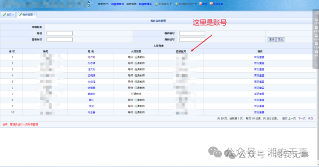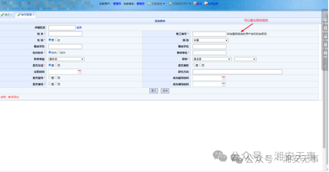 登入进去,点击添加教师可以发现用户密码规则,编号就是密码