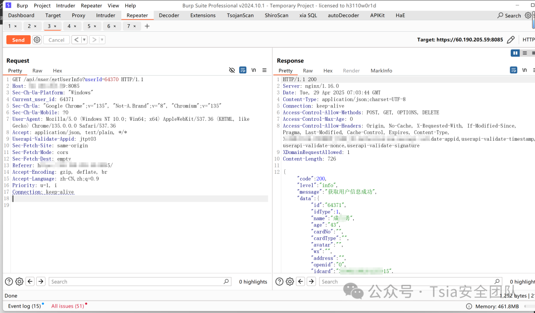 测试短信轰炸,验证码复用,绑定漏洞也不行。但是用自己手机号登录后有一个接口有点奇怪,测了下可以遍历全站所有用户的信息,是用Current_user_id做用户权限校验的,上面的usserId是个幌子。GET /api/user/getUserInfo?userId=64370 HTTP/1.1