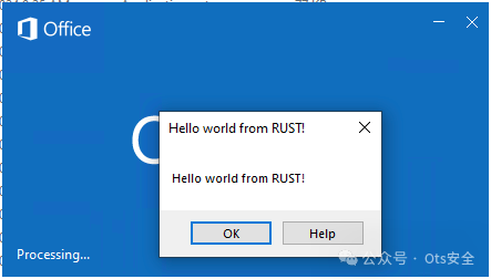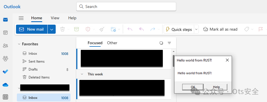 图 6 – 概念验证 – Outlook 弹出“Hello World”消息