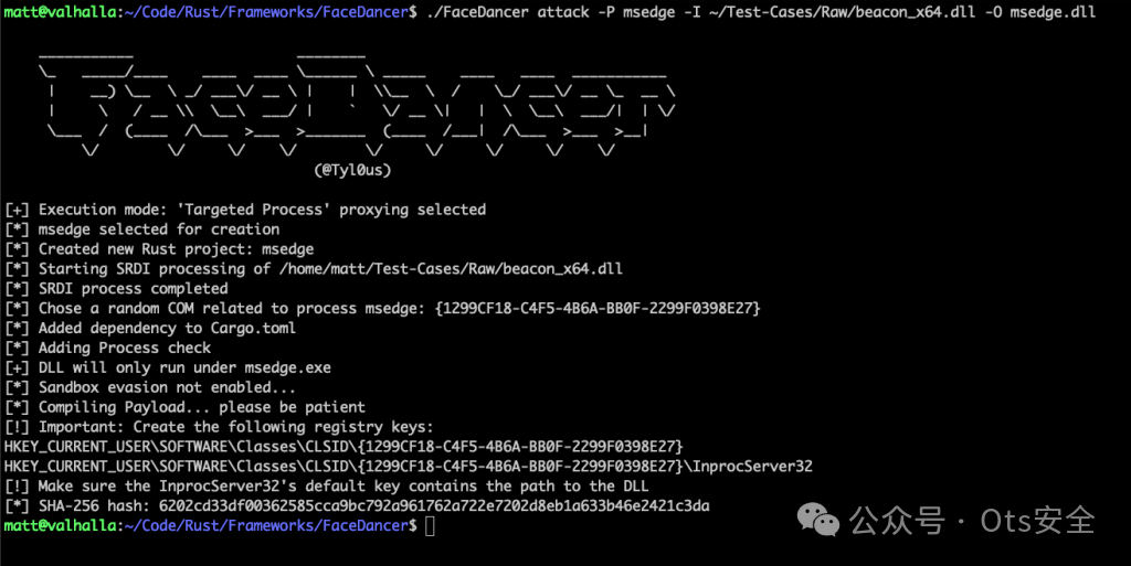 现在,编译和设置这些 DLL 的过程可能有点繁琐,所以我创建了一个名为 FaceDancer 的工具来帮助自动化这个过程。在下面的示例中,我将选择仅针对进程 msedge。我可以使用任意 DLL Payload(在本例中,我使用的是 Cobalt Strike 生成的原生 DLL,没有规避机制),将其输入到这个工具中,它将生成以下内容: