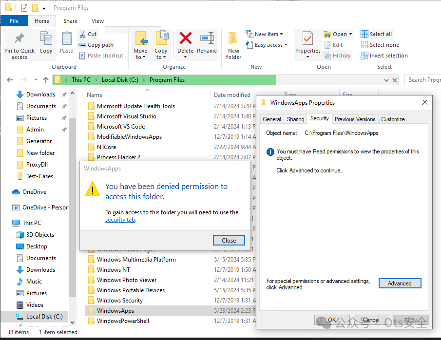 首先,我们可以看到这些应用程序的安装目录与之前的安装目录不同。“C:\Program Files\WindowsApps\”这个路径似乎被严格锁定。当我们尝试访问该文件夹查看内容时,即使以管理员身份运行,也遭到拒绝。