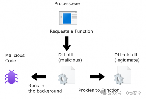 现在,您不能在同一个文件夹中拥有两个同名的 DLL,因此,有了此写入权限,我们可以将 DLL 重命名为任何我们想要的名称。这对于第二部分(代理方面)至关重要。此技术背后的想法是仍然允许访问我们目标 DLL 中的函数。为此,我们需要将所有来自恶意 DLL 的流量转发到合法 DLL;这确保我们不会中断应用程序的运行。当应用程序尝试加载 DLL 时,它将加载恶意 DLL,从而有效地允许我们的恶意代码运行,并将任何函数请求转发到合法 DLL,而不会中断或崩溃。这将我们的恶意 DLL 变成应用程序和合法 DLL 之间的代理。