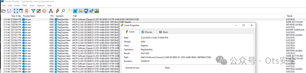 图 14 – OLK.exe 成功查询 HKCU COM 对象