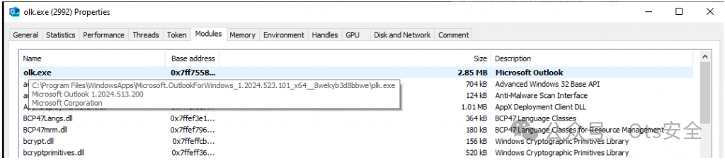 从下图可以看出,这种方法有效,我们能够强制新版 Outlook 加载我们的 DLL。虽然我们只披露了存储在锁定的 WindowsApp 文件夹中的这些新应用程序,但这个问题实际上更为普遍,影响了许多其他应用程序。