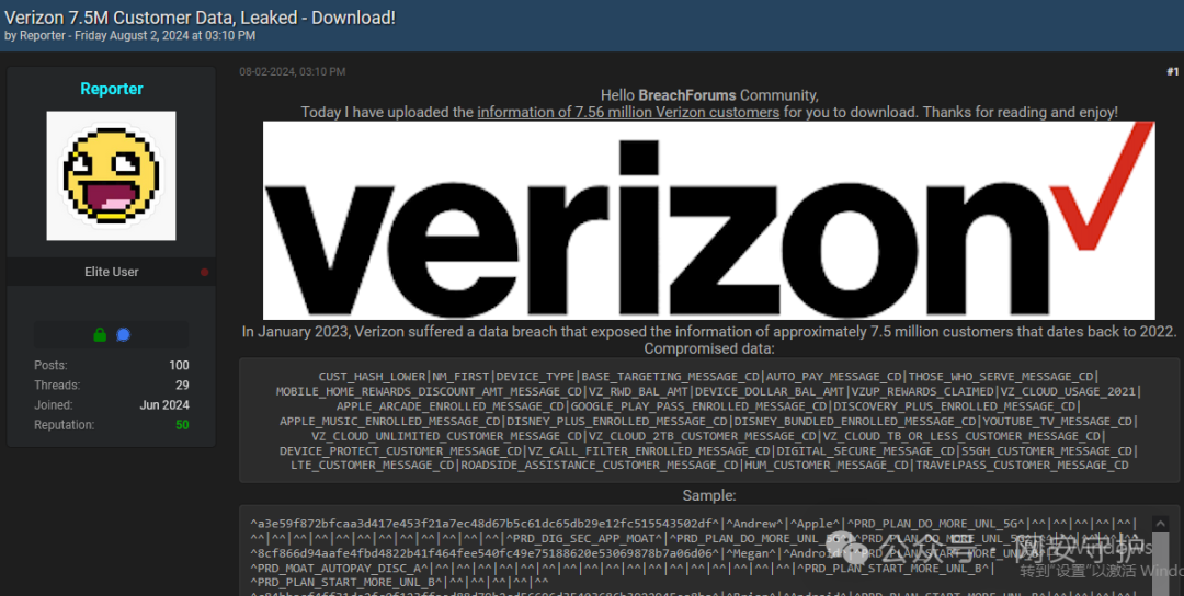 近日,BreachForums 论坛上一位名为 IntelBroker 的用户声称发布了 Verizon 通信公司的客户数据,引发广泛关注。 这名威胁者声称掌握了包含 750 万 Verizon 客户记录