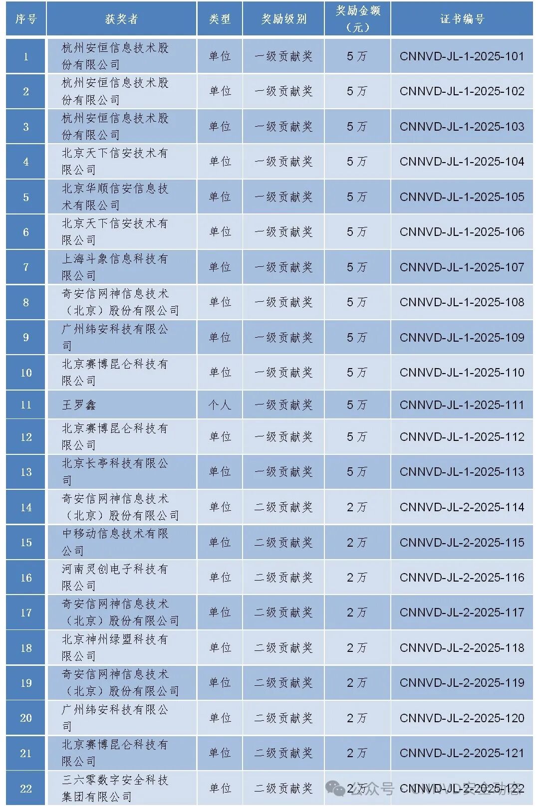 近期,CNNVD开展了2025年度(第一期)接报漏洞奖励评选工作,其中22个漏洞在我国网络安全漏洞预警及风险消控工作中发挥了积极作用,获奖名单如下。