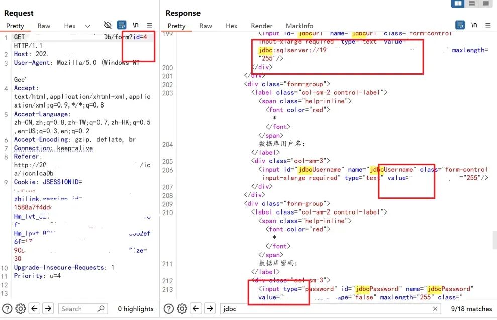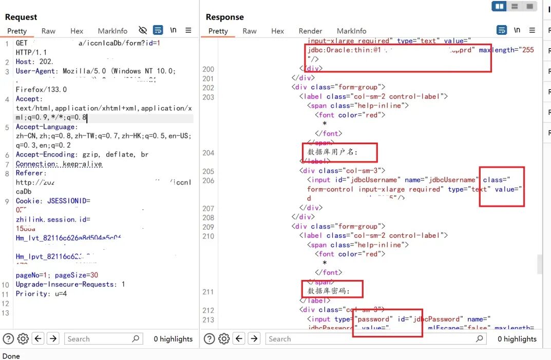 在前端其实只能看到一个数据库的地址,用户密码。也就是id=1时的数据,而转化为数据包观察,直接实现数据库信息遍历,拿下五台数据库敏感信息,包含mysql,oracle等类型,