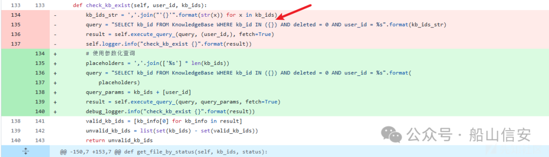 在该代码中,kb_ids 的值通过字符串拼接直接嵌入到 SQL 查询中。具体来说,代码 使用 ','.join("'{}'".format(str(x)) for x in kb_ids) 将 kb_ids 的值手动转换为字符串并添加 单引号,然后直接拼接到 SQL 查询的 IN 子句中。这种方式看似简单,但存在严重的安全 隐患。如果 kb_ids 的值来自用户输入且未经过严格验证或过滤,攻击者可以通过构造恶 意输入来破坏 SQL 查询的逻辑。例如,如果 kb_ids 中包含类似 "1' OR '1'='1" 的值,生 成的 SQL 查询可能会变成:SELECT kb_id FROM KnowledgeBase WHERE kb_id IN ('1', '1' OR '1'='1') AND deleted = 0 AND user_id = 100,这段查询的逻辑会被篡改, 导致 OR '1'='1' 永远为真,从而绕过条件限制,返回所有数据。