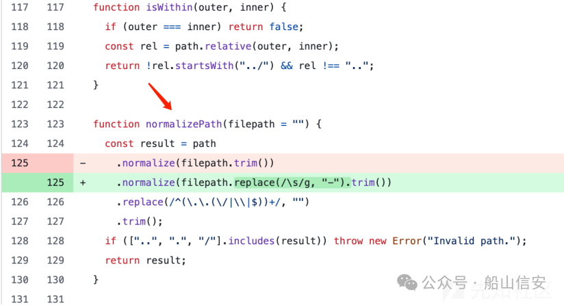 AnythingLLM 中存在一个路径遍历漏洞 CVE-2024-5211,该漏洞源于 normalizePath()函数未能有效防御路径遍历攻击,允许攻击者通过特制的路径绕过安全限 制,读取、删除或覆盖关键文件。 CVE-2024-5211 的修复代码如下图所示。