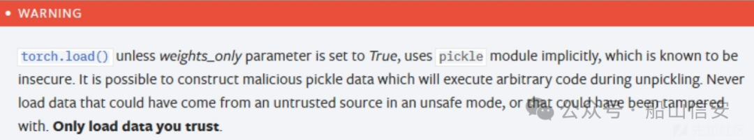 PyTorch 文档对于 torch.load()函数的介绍中存在如下一个警告。如下图所示。