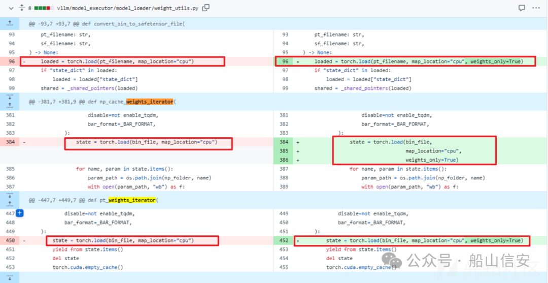漏洞修复代码将 vLLM 项目中所有在不受信任数据上调用的 torch.load()函数的 weights_only 参数设置为 True,从而修复了此漏洞。