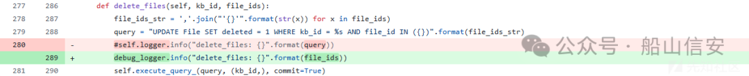 从代码中可以看出漏洞成因是直接将 file_ids 的值通过字符串拼接嵌入 SQL 查询中。 如果 file_ids 包含用户输入且未经过严格验证或过滤,攻击者可以通过构造恶意输入 (如 "1' OR '1'='1")破坏 SQL 查询逻辑。生成的 SQL 查询可能会变成 UPDATE File SET deleted = 1 WHERE kb_id = %s AND file_id IN ('1' OR '1'='1'),导致 OR '1'='1' 永远为真,从而将所有文件标记为已删除,而不仅仅是目标文件。