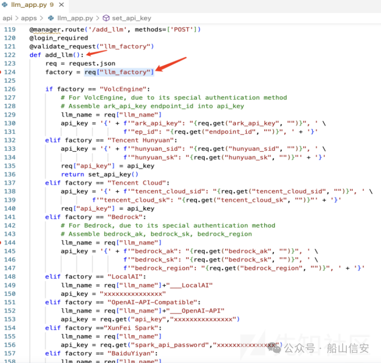 CVE-2024-10131 是 llm_app.py 文件中的 add_llm() 函数存在的一个远程代码执行 漏洞。该函数的代码如下所示。